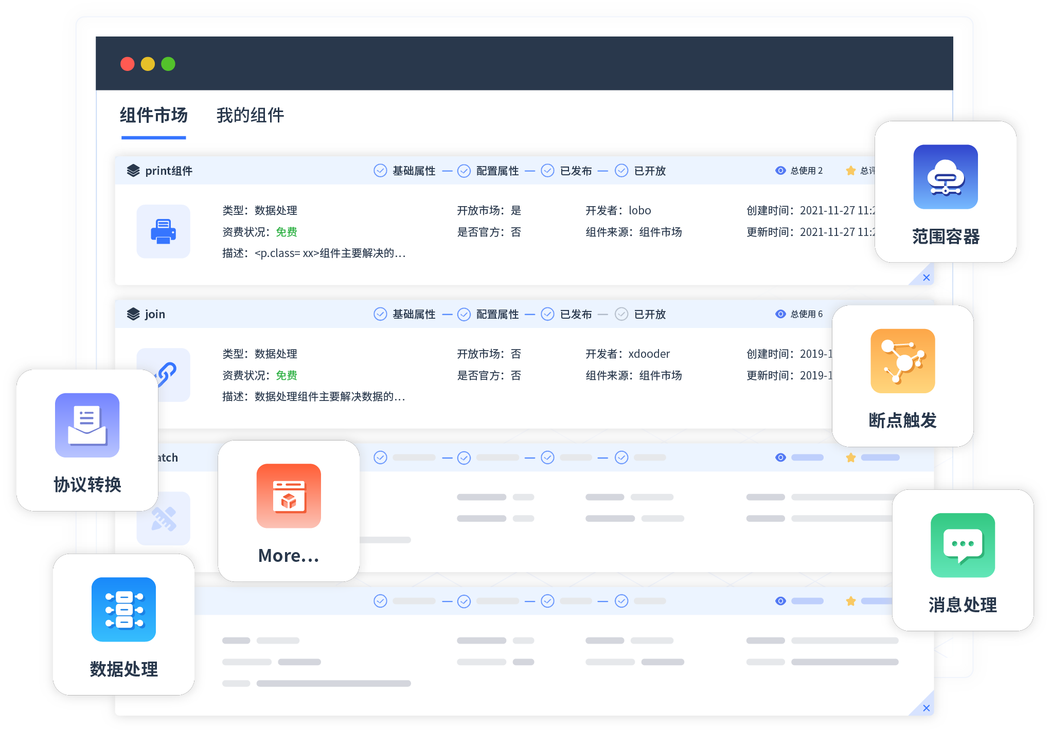 针对集成场景,pg大满贯提供组件市场,例如协议转换、消息处理、文件操作等。除平台提供的组件外,客户可以自定义所需组件。
